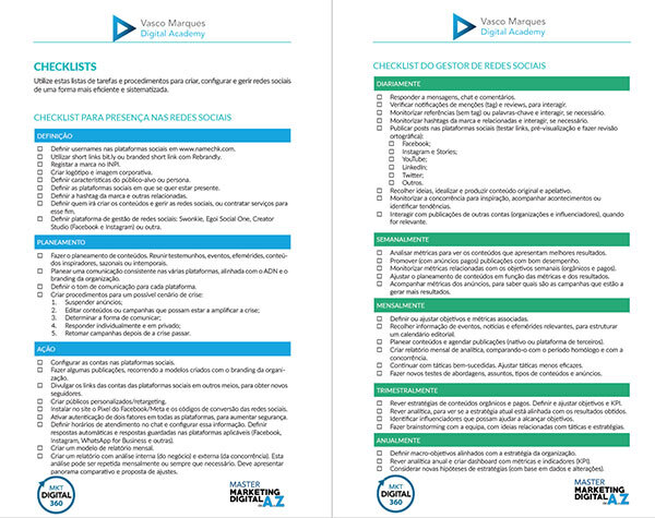 Um conjunto de listas de tarefas e procedimentos para o ajudar a criar, configurar e gerir redes sociais de uma forma mais eficiente e sistematizada.
